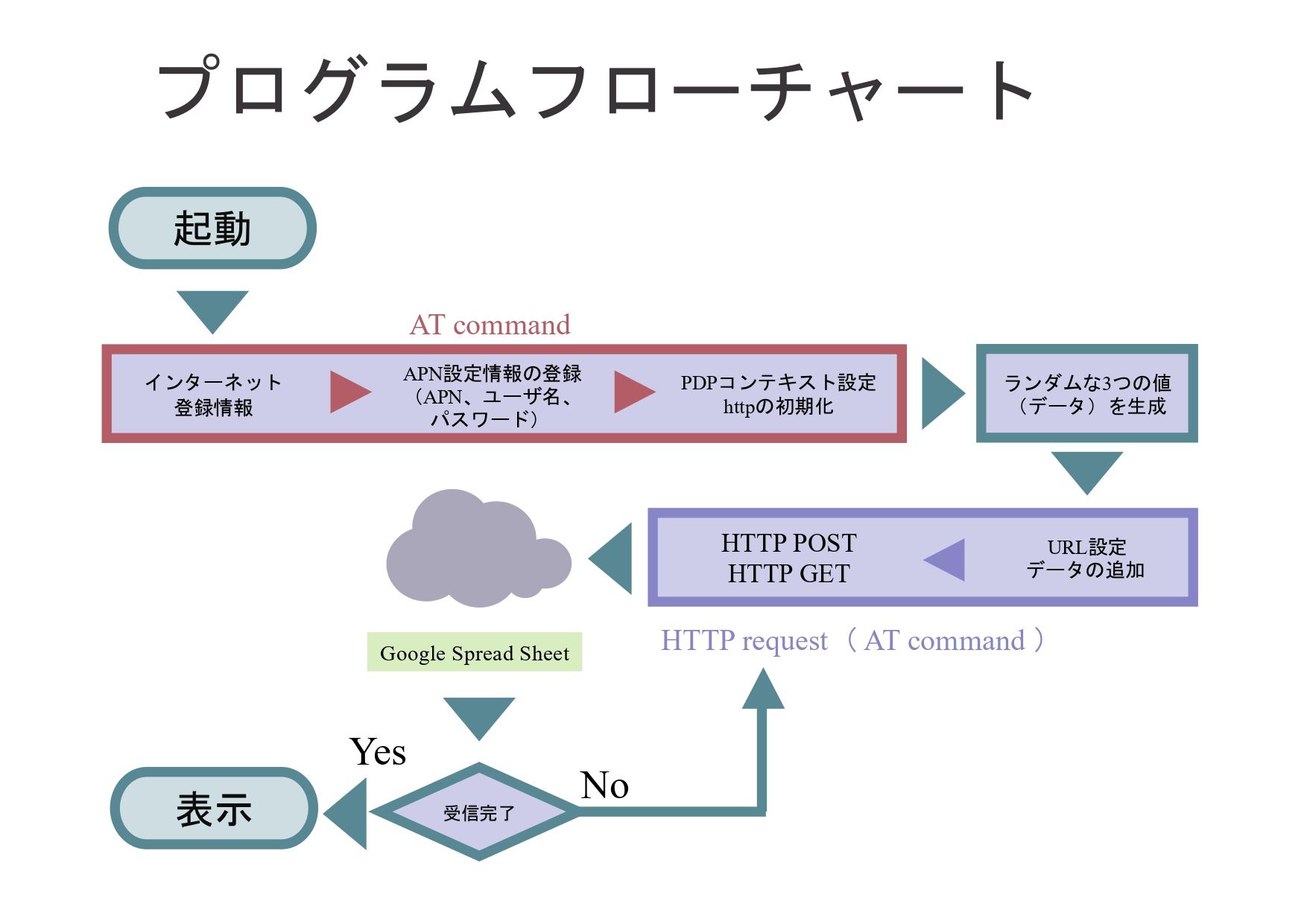 function doGet(e) { Logger.log("Received GET request: " + JSON.stringify(e)); var sheet = SpreadsheetApp.getActiveSpreadsheet().getSheetByName('シート1'); if (!sheet) { return ContentService.createTextOutput("Error: Sheet not found").setMimeType(ContentService.MimeType.TEXT); } // パラメータを取得 var chipid = e.parameter.chipid || "Unknown"; var val0 = parseFloat(e.parameter.val0) || 0; var val1 = parseFloat(e.parameter.val1) || 0; var val2 = parseFloat(e.parameter.val2) || 0; // スプレッドシートにデータを記録 sheet.insertRowBefore(2); sheet.getRange(2, 1).setValue(new Date()); // 受信日時 sheet.getRange(2, 2).setValue(chipid); sheet.getRange(2, 3).setValue(val0); sheet.getRange(2, 4).setValue(val1); sheet.getRange(2, 5).setValue(val2); return ContentService.createTextOutput("Data received successfully").setMimeType(ContentService.MimeType.TEXT); }以下は本プログラムの動作及び、システム構成です。