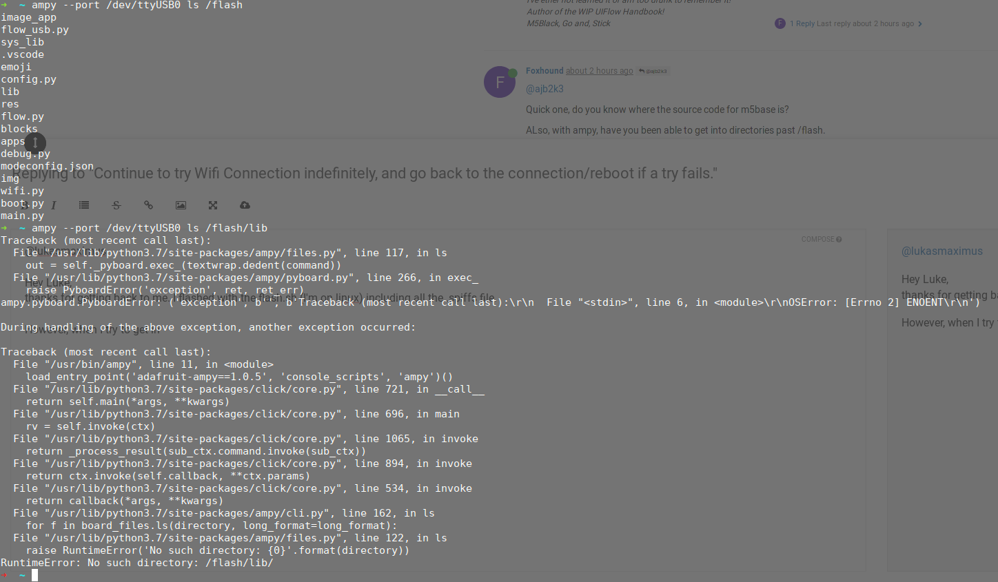 which micropython version are you using? if you did a custom flash not from the official m5stack burner you may have forgotten to flash the .spiffs file which contains all the folders and files you want to put on the filesystem