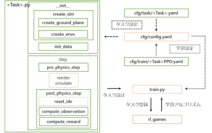 A configuration file written in YAML is prepared for each task. Common settings are in the config.yaml in the cfg directory, and settings can be changed without changing the YAML file with command line options using Hydra. The detailed settings for each task environment and PhysX are stored in the cfg/task/ directory, and the algorithm selection and structure are stored in the cfg/train/ directory.