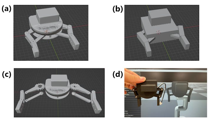 Figure 11: Creating a gripper for myCobot (a) Published gripper model (b) Collision model parts created according to the model (c) Visual model parts disassembled from the gripper model (d) Isaac Gym Comparison of drawing and actual gripper
